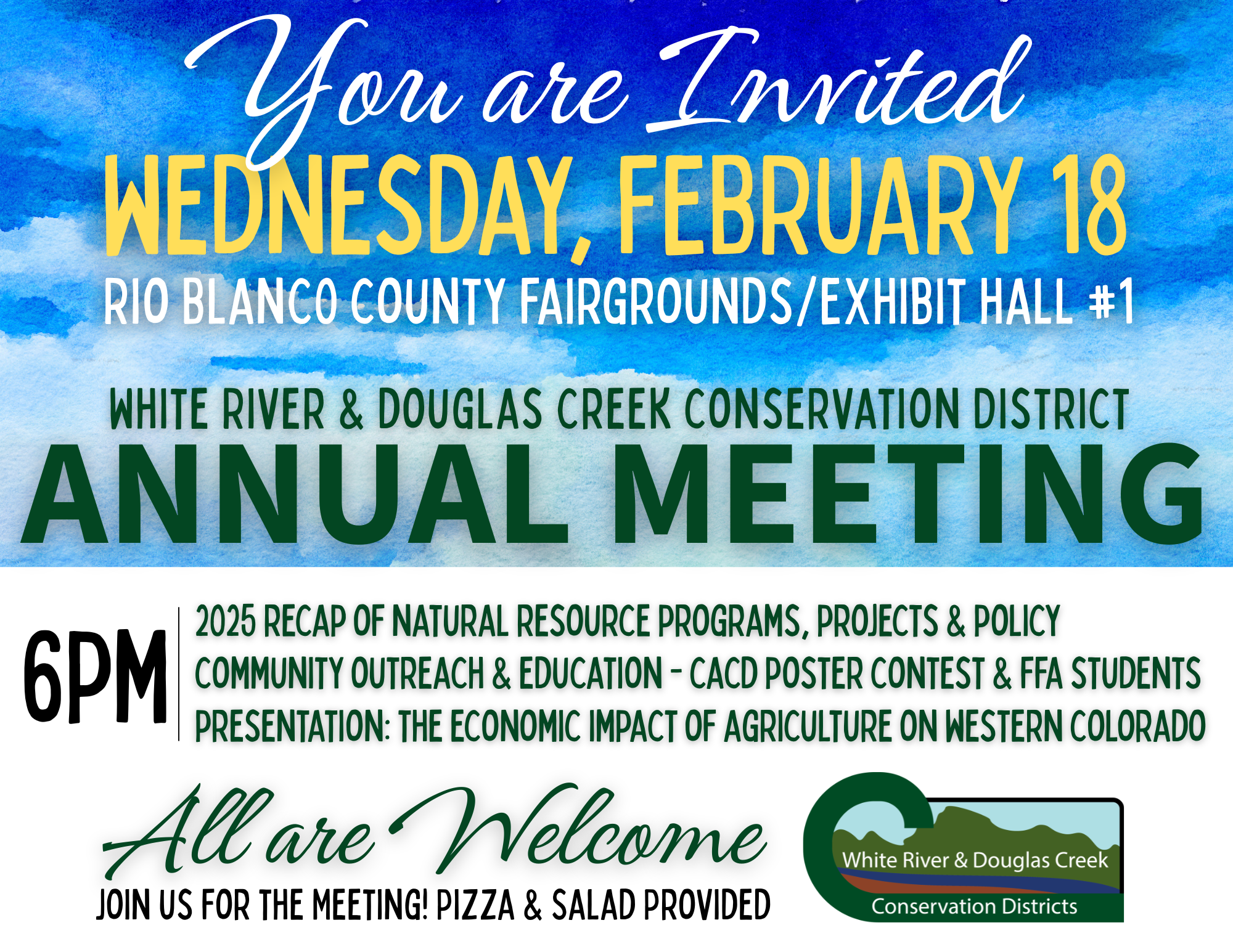 Join us for a casual evening where the Districts will recap the 2025 Natural Resources programs, projects and policy issues, the FFA creed speaker winners from Rangely and Meeker will recite the creed in preparation for District competitions March 3rd, the CACD will present the Rangely and Meeker local poster contest winners, and Janie Vanwinkle will present a study by Nathan Perry, PhD, on the Economic Impact of Agriculture on Western Colorado. Pizza and Salad will be provided.
